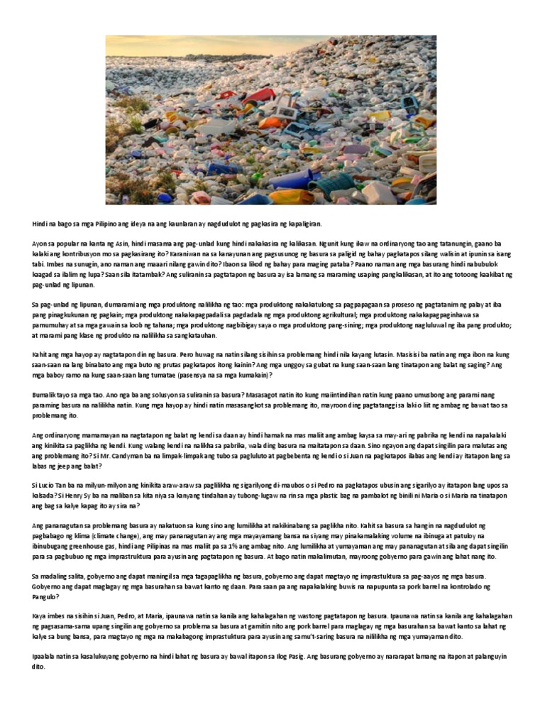 Kung walang mapipiling koleksyon kung saan ka nakatira makipag-ugnay sa. Huwag mag tapon ng basura kung saan saansa halip itago na lng ito 3. Ang problema sa basura ay isang pandaigdigang alalahanin.