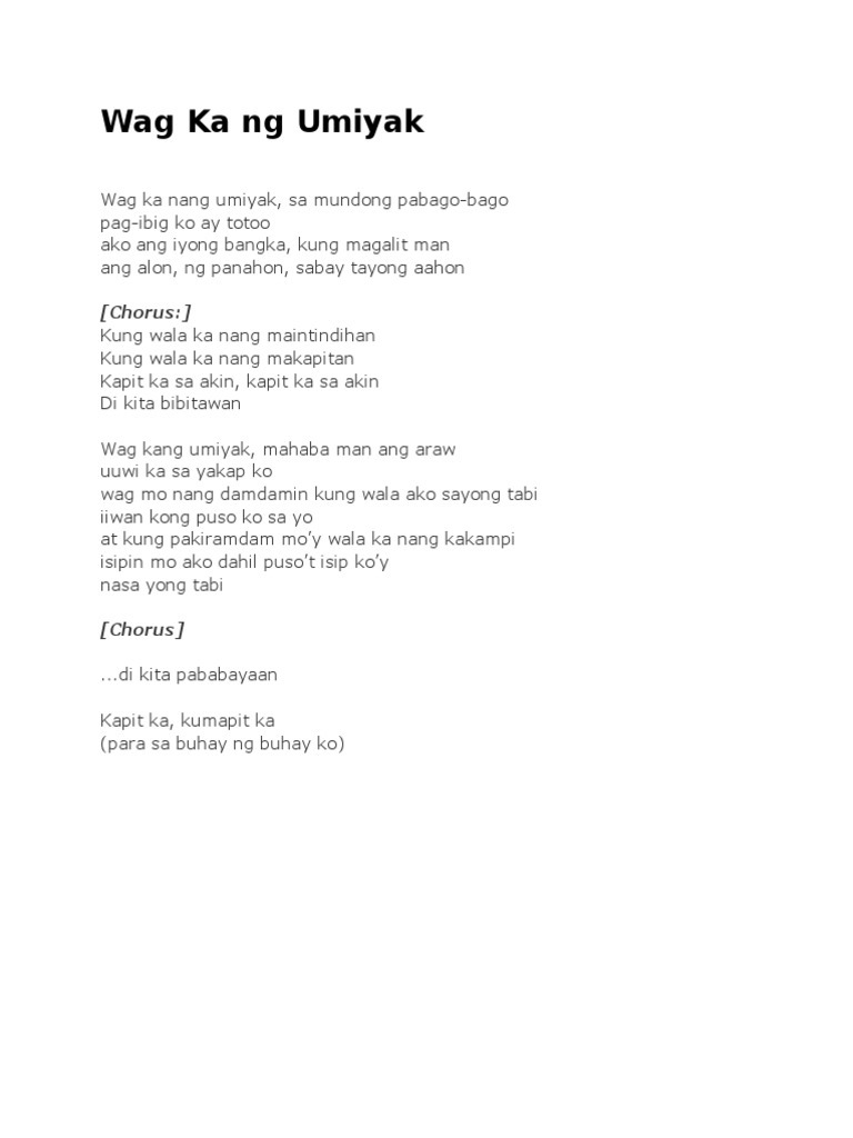 Kung wala ka nang maintindihan Kung wala ka nang makapitan Kapit ka sa akin Kumapit ka sa akin Hindi kita bibitawan Hindi kita pababayaan Hindi kita pababayaan Wag ka nang umiyak. Wag ka nang umiyak album. Each strumming once added will be approved by the author moderator and user community before being.